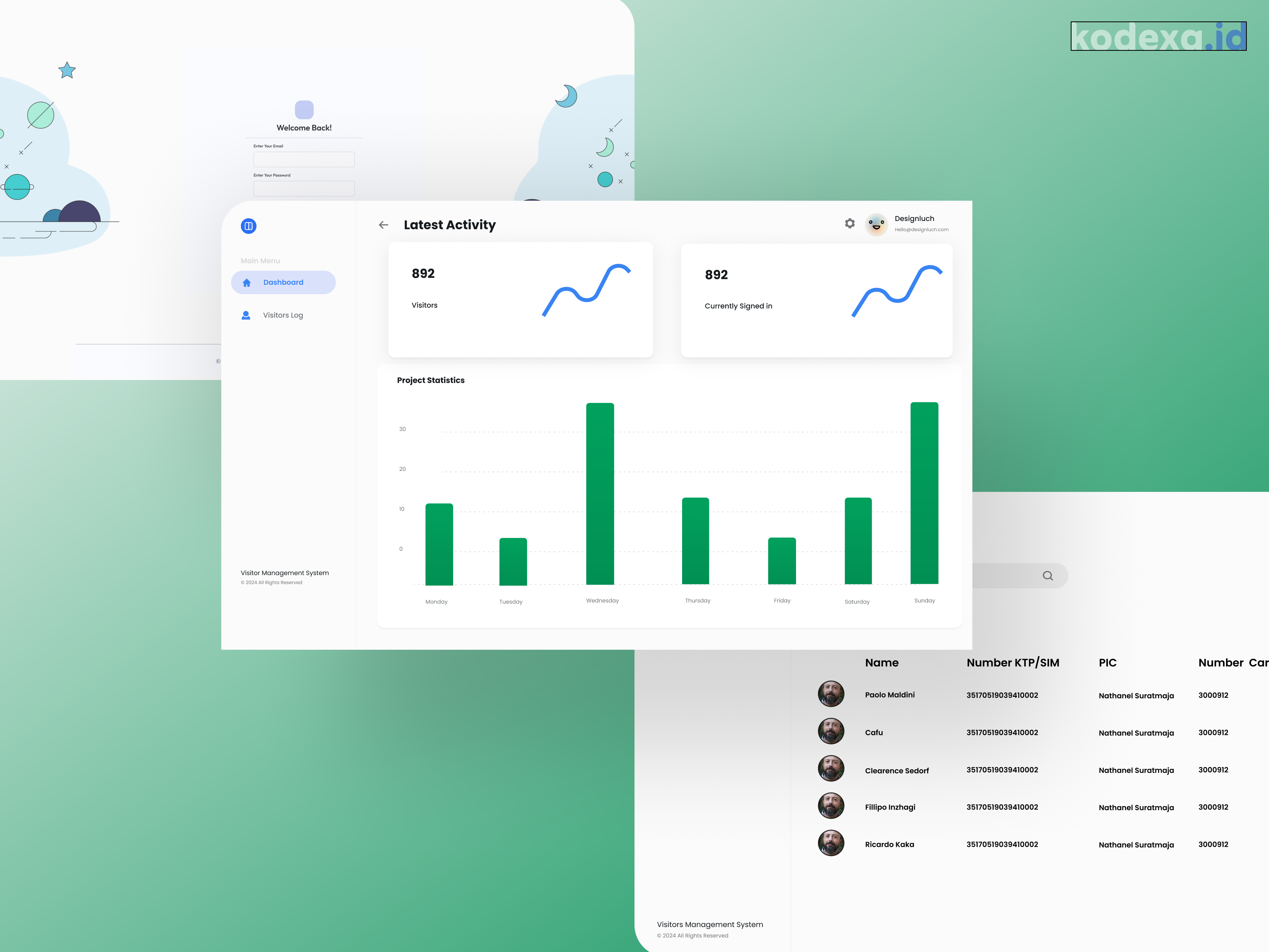 Kami mengembangkan Visitors Management System berbasis dashboard yang memungkinkan staf hotel memantau aktivitas pengunjung secara langsung. Setiap pengunjung dapat didaftarkan dengan cepat melalui sistem digital, sementara dashboard utama menampilkan statistik kunjungan, aktivitas terbaru, serta data pengunjung secara terstruktur. Dengan tampilan antarmuka yang sederhana dan responsif, sistem ini membantu tim operasional dan keamanan hotel mengelola akses pengunjung dengan lebih cepat, akurat, dan efisien, sekaligus meningkatkan standar keamanan dan profesionalitas layanan di Hotel Mulia Bali.